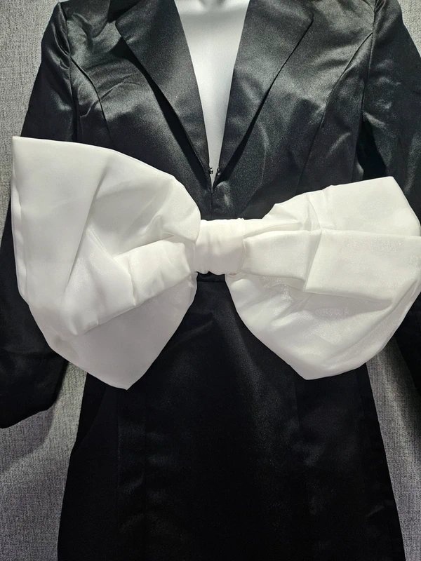 Black Satin Blazer Dress with a deep V-neckline and a statement oversized white organza bow. Perfect for formal occasions and evening events. Crafted from satin with a lightweight organza bow, it offers a sleek and elegant silhouette.