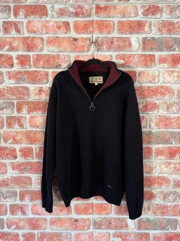 The Barbour Navy Wool Half Zip Jumper is available in sizes L.
