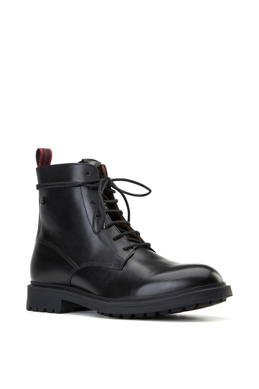 Stylish Base London boot in black leather with a fashion-forward design. Features exquisitely finished leather uppers, extra long laces, and Ortholite cushioning for comfort. Perfect for a smart-casual look.