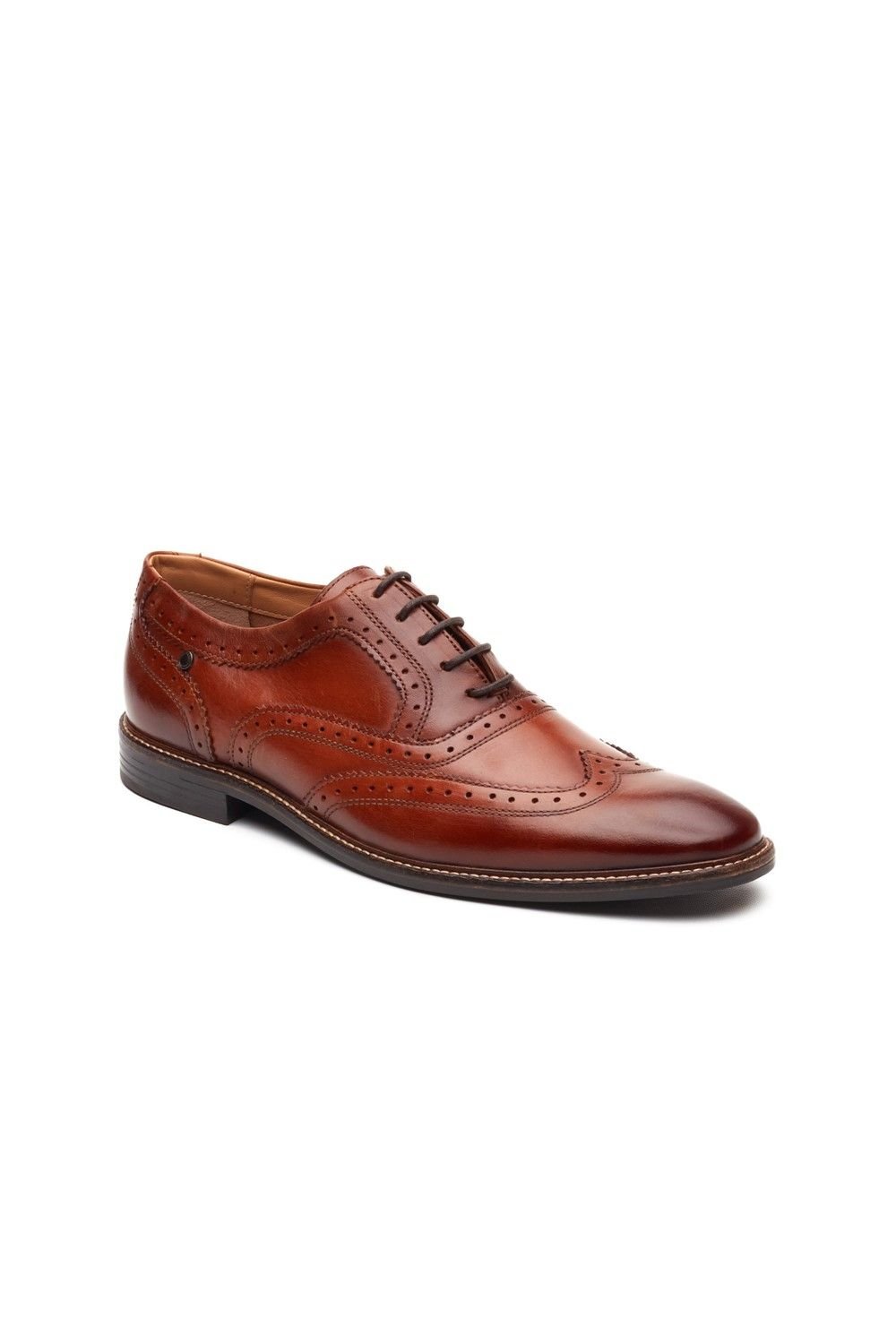 Stylish Base London men's brogue shoe in tan leather. Features a refined Oxford brogue design with Ortholite cushioning for all-day comfort. Ideal for formal and smart-casual occasions.