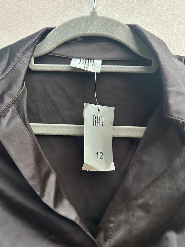 The Bay Black Satin Cropped Shirt is available in sizes M.