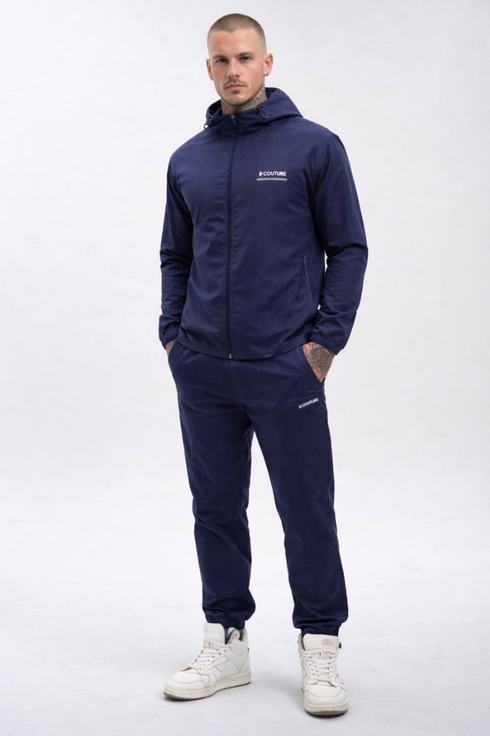 Stylish BCouture navy tracksuit set made from 100% woven polyester. The set includes a full-zip hooded jacket and matching trousers. Ideal for casual wear with its lightweight, breathable, and shower-resistant fabric.