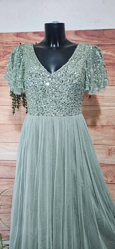Designed in mint green, this midi dress by Beauut features a sequin-embellished bodice and a soft tulle skirt. The V-neckline and flutter sleeves create a flowing, feminine silhouette. Perfect for weddings, parties, proms, bridesmaid or special occasions.
