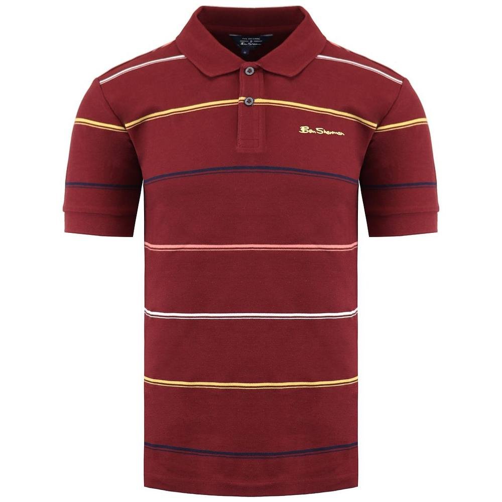 Stylish Burgundy striped polo shirt by Ben Sherman. Featuring a classic collared neckline, short sleeves, and a vibrant striped pattern in burgundy, yellow, and blue. Perfect for casual outings or smart-casual events.