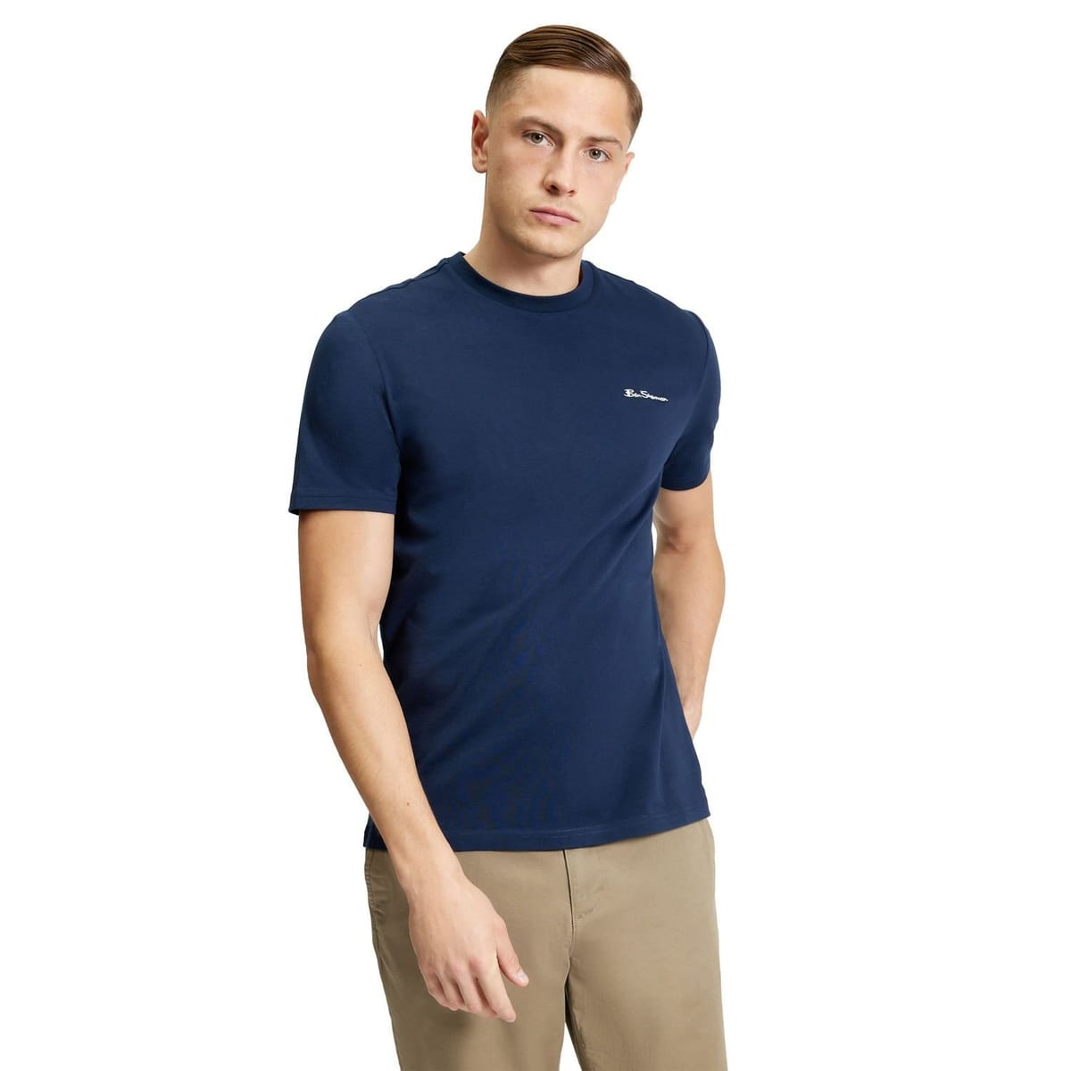Stylish dark navy cotton crew neck t-shirt by Ben Sherman. Made from 100% cotton for ultimate comfort and breathability. Features a small embroidered logo on the left chest and twin needle stitching for durability.