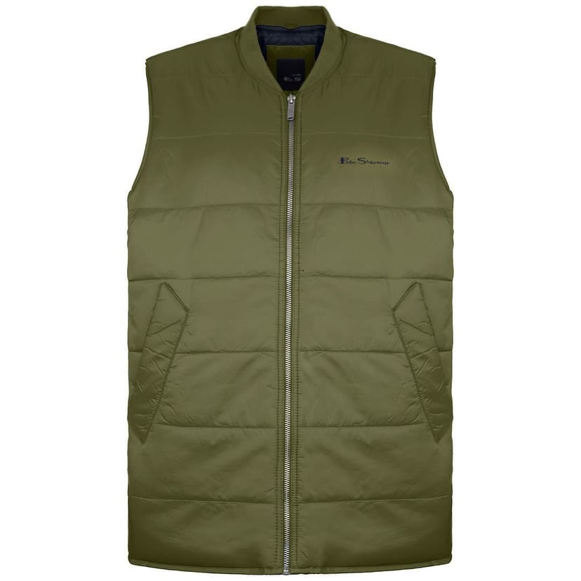 Stylish Ben Sherman sleeveless gilet in green quilted fabric. Features a zipper closure and two front pockets. Ideal for layering over casual outfits.
