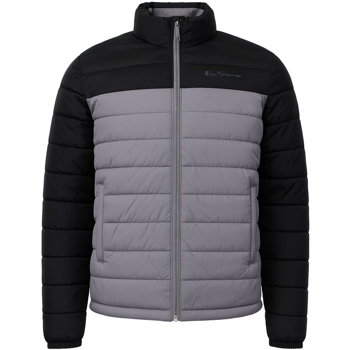 Elegant Ben Sherman padded jacket in grey with a black contrast. Features a collared neckline, full zip closure, and quilted detailing for a modern, refined look. Ideal for cold-weather sophistication.