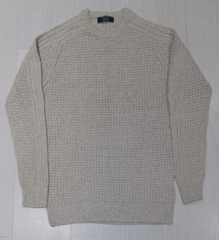 This chunky knit jumper by Bershka features a light beige colour and a modern waffle/textured pattern. Made from soft acrylic, it has ribbed detailing on the sleeves and hem. Ideal for layering in any season.