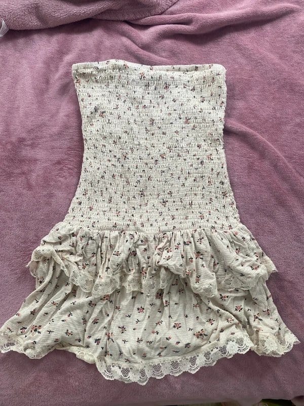 The Bershka Off-White Floral Bandeau Mini Dress is available in sizes S.