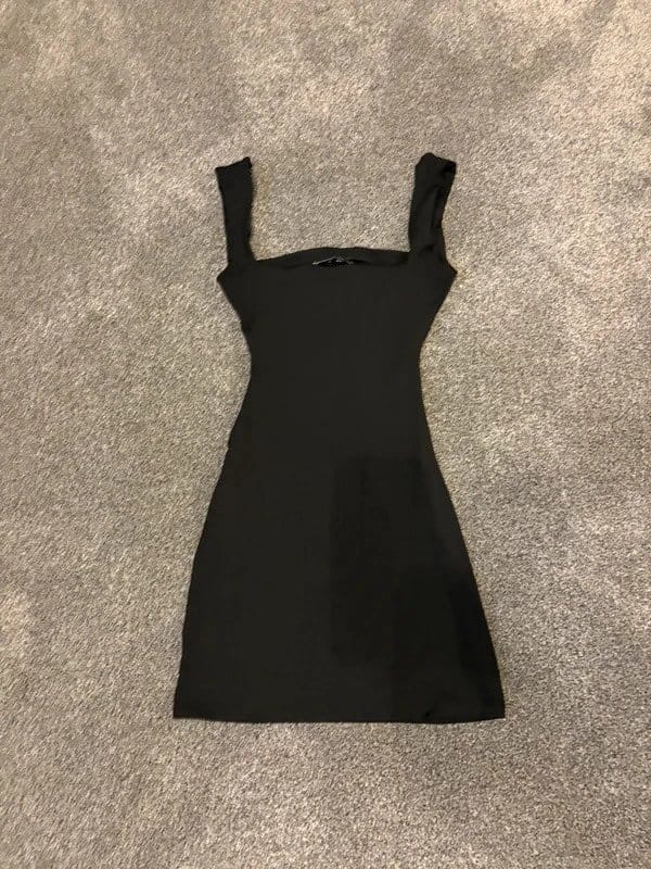 See all outfit ideasThis black mini dress from Bershka features a body-con silhouette with ruched detailing on the sides. Made from a soft stretchy material, it is very flattering and perfect for a night out.
