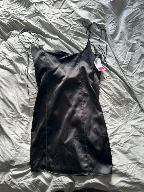 The Bershka Black Silk Mini Dress Tight Fit is available in sizes S.