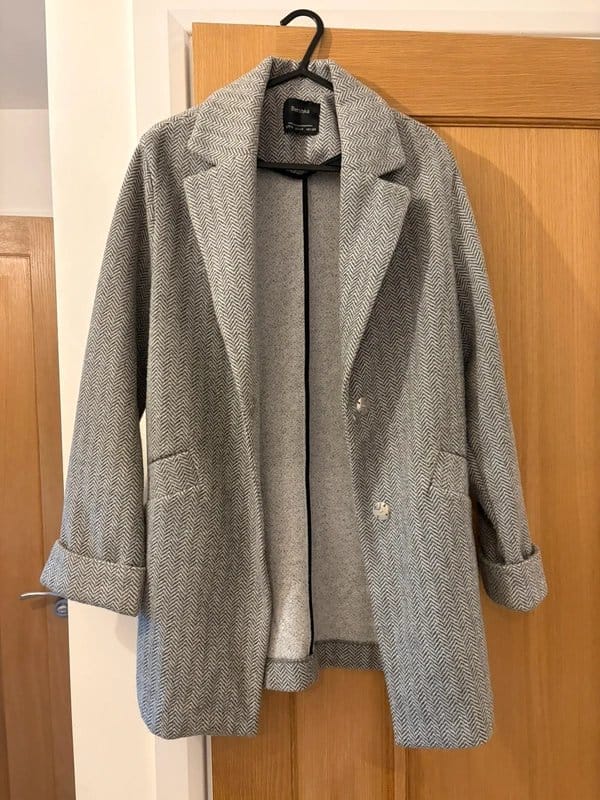 The Bershka Grey Herringbone Blazer is available in sizes S.