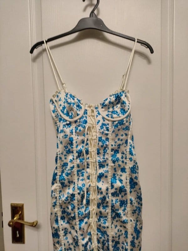 Charming Bershka mini dress in blue and white floral print. Features a corset-style bodice with lace-up front and adjustable straps, and a slightly flared skirt. Perfect for casual outings or summer events.