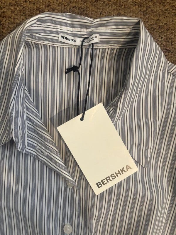 Stylish Bershka shirt in blue and white stripes with a waist-cinching string for a flattering fit. Perfect for casual work or office wear.