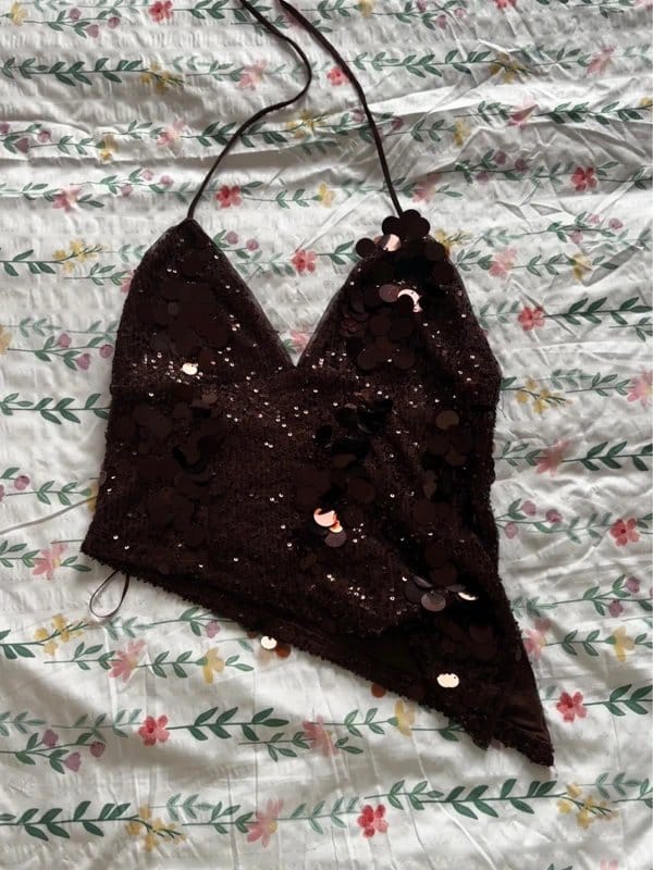 The Bershka Brown Sequin Asymmetrical Top is made from sequins, polyester.