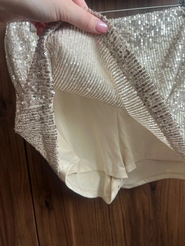 This Bershka skort features a champagne gold sequin upper with a cream skirt underneath. The sequin fabric adds a touch of glamour, while the cream skirt provides a subtle contrast. Ideal for evening events or special occasions.