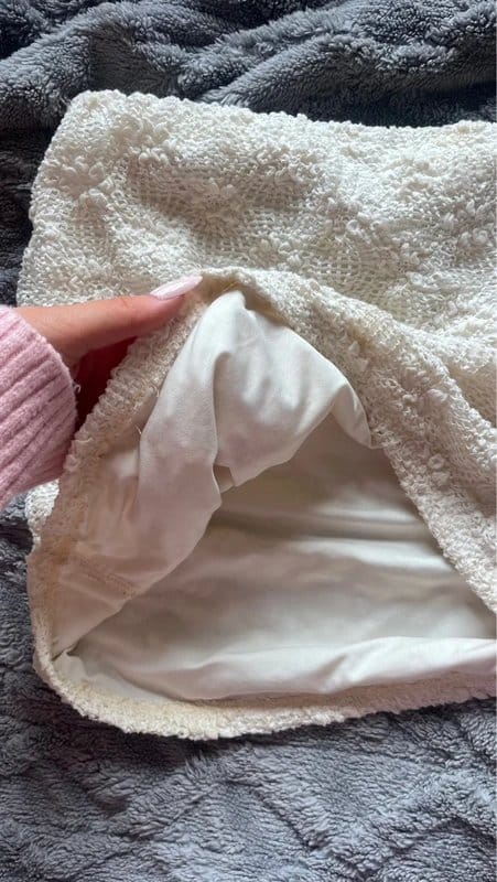 Charming cream crochet floral embroidered mini skirt by Bershka. Features a stretchy elastic waistband and a cream underlay fabric for comfort and coverage. Perfect for a retro-inspired look.
