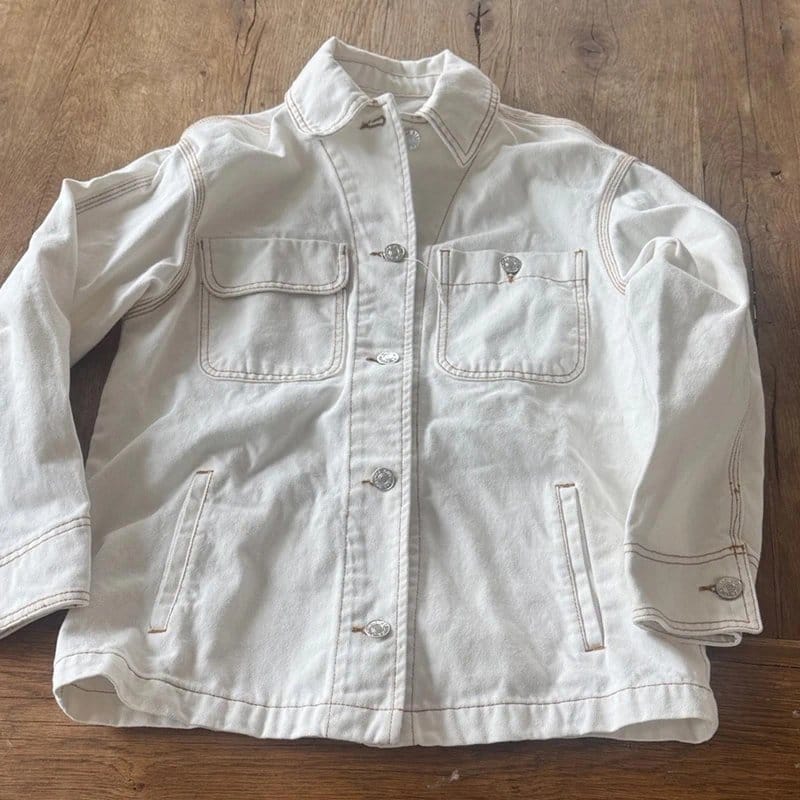 Chic cream denim jacket. Features a classic collar and subtle stitching. Perfect for casual outings or layering over your favourite tops.