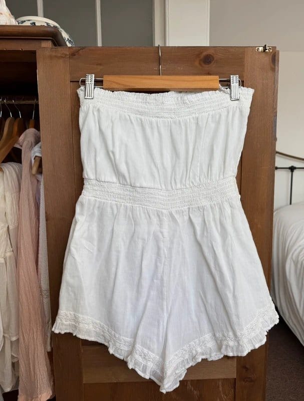 This Bershka cream jumpsuit features a lightweight cotton fabric with a romantic and feminine design. Perfect for spring and summer occasions, it has a high waist, adjustable straps, and a fringed hem for added charm.