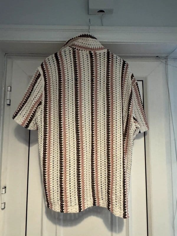 The Bershka Crochet Shirt in Cream, Brown, and Pink Stripe is available in sizes M.
