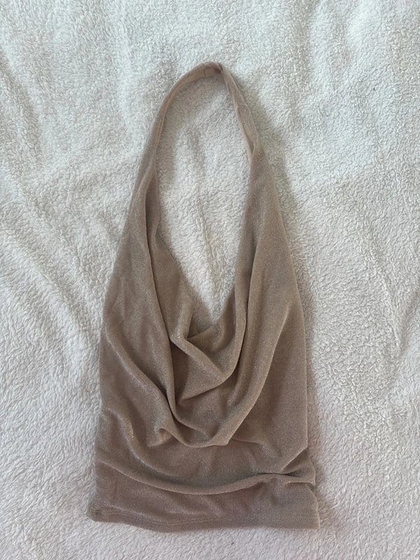 Back to Bershka Draped Halter Neck Top in Gold Shimmery Beige →