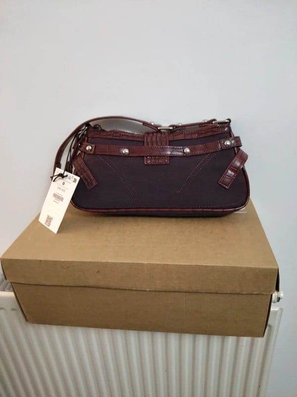 This Bershka shoulder bag features a burgundy faux leather trim with embossed mock-croc detailing. It combines denim and faux suede materials for a Y2K-inspired look.