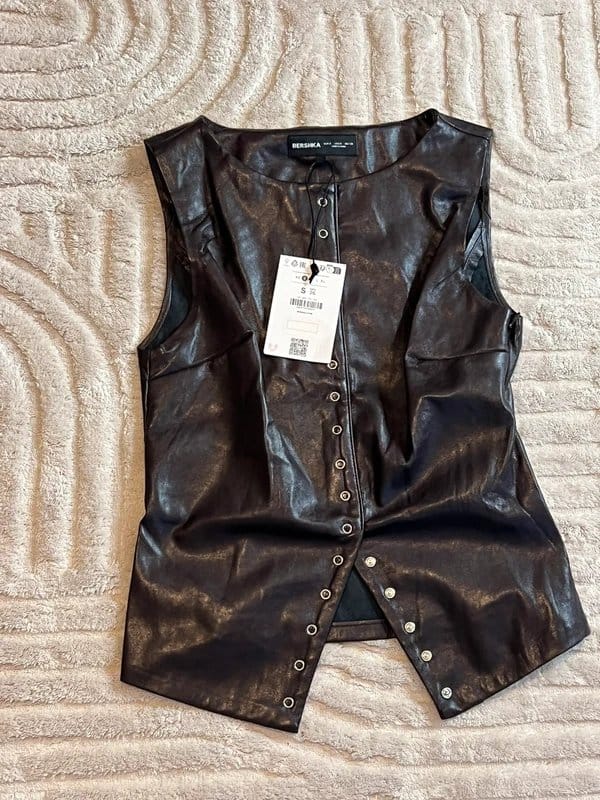 The Bershka Brown Faux Leather Sleeveless Top is available in sizes S.