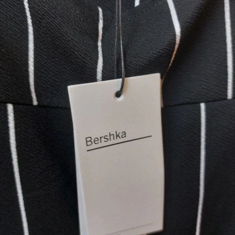 Stylish Bershka jumpsuit in black with white stripes. Features a slim fit and long sleeves, perfect for casual or smart-casual occasions.