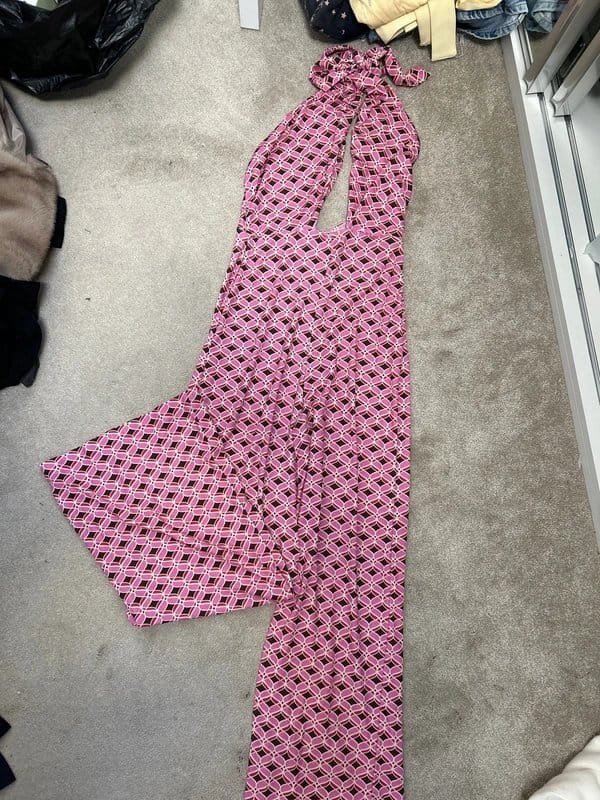 This pink patterned halter-neck jumpsuit by Bershka is a petite size, hemmed for a 5ft 4in frame. Made from a stretchy material, it features a unique design perfect for a party.