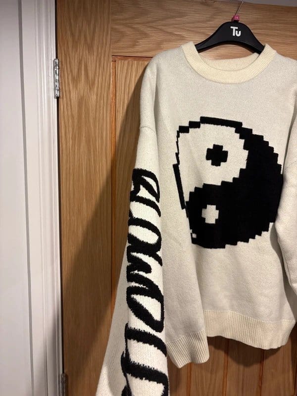 Trendy Bershka jumper in cream and black featuring a pixelated Yin-Yang symbol on the front and zigzag patterned sleeves. Made from knitted fabric for a cozy fit.