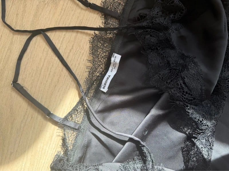 Stylish Bershka black lace cami top with delicate lace details and adjustable straps. Perfect for layering or wearing alone for a chic look.