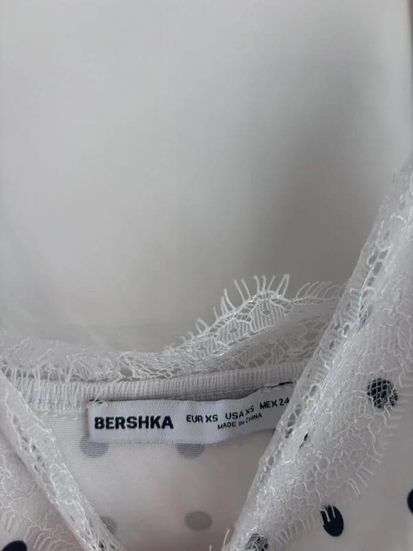 Delicate lace polka dot top in black and white from Bershka. Features a sheer polka dot pattern with lace trim for a feminine touch. Perfect for casual or semi-formal occasions.
