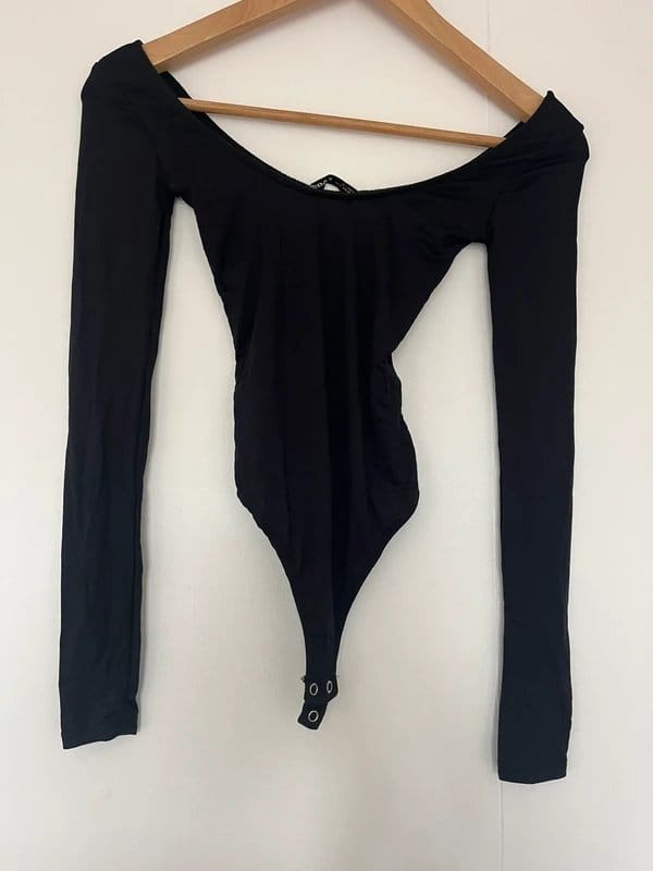 Sleek black long sleeve bodysuit with an off-the-shoulder neckline and adjustable straps. Made from stretchy fabric for a comfortable fit, perfect for layering or wearing solo.