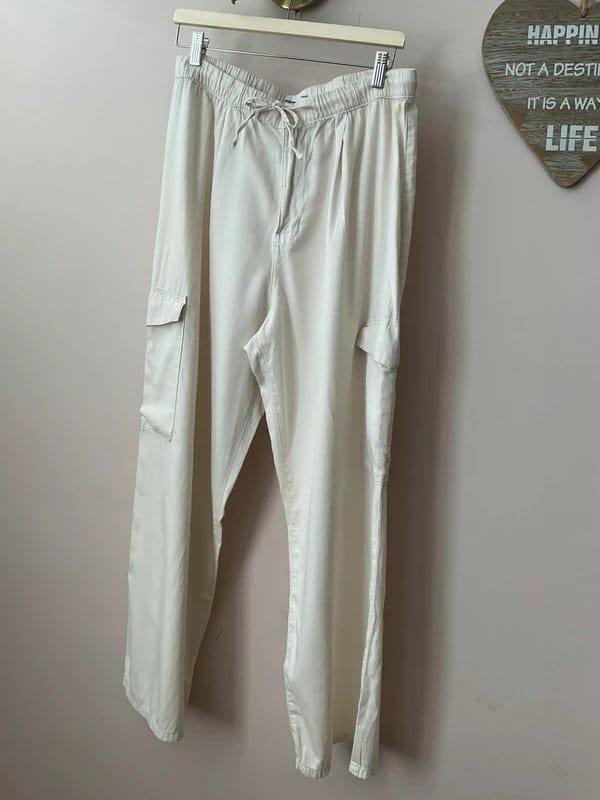 The Bershka Cream Lightweight Wide Leg Cargo Trousers is available in sizes L.