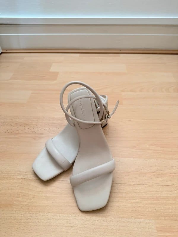 Minimalist block heel sandals from Bershka in a versatile cream shade. These feature a trendy square-toe design and comfortable padded tubular straps. Perfect for summer parties, weddings, or dressing up a pair of jeans.