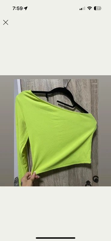 Neon green asymmetric one shoulder crop top — perfect for summer or festival. Designed in vibrant neon green, this one-shoulder crop top features sequin embellishments for a dazzling effect. Crafted from lightweight polyester with a sheer finish, it adds a pop of color to any summer outfit. Ideal for casual wear or festival vibes.