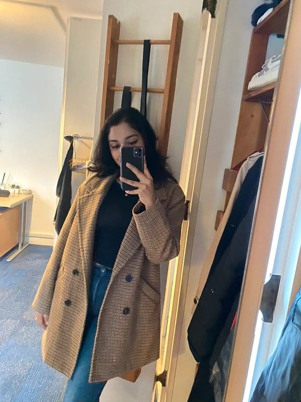 The Bershka Brown Plaid Oversized Blazer is available in sizes S.