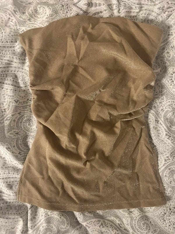 The Bershka Gold Glitter Ruched Bandeau Top is made from polyester, spandex.