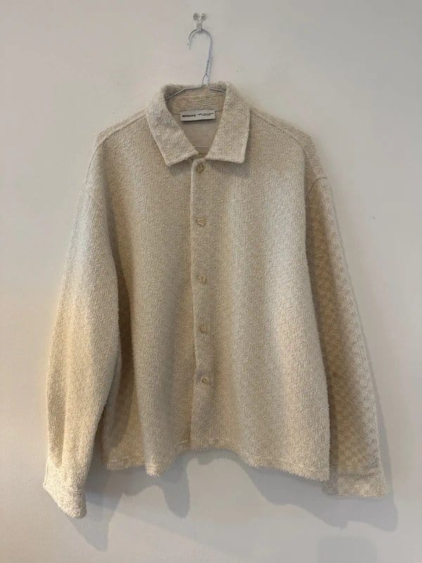 This Bershka shacket in cream features a textured knit fabric with a button-front closure. It's designed for a relaxed fit and is perfect for casual wear.