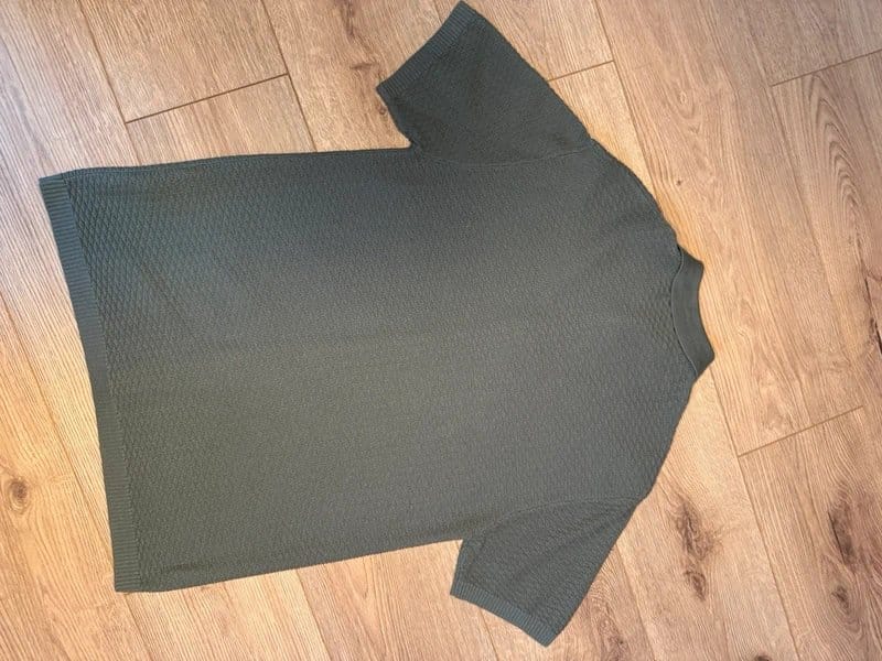 Stylish Bershka men's shirt in khaki and dark green. Made from a textured knit fabric, this shirt features a crew neckline and short sleeves. Ideal for casual wear.