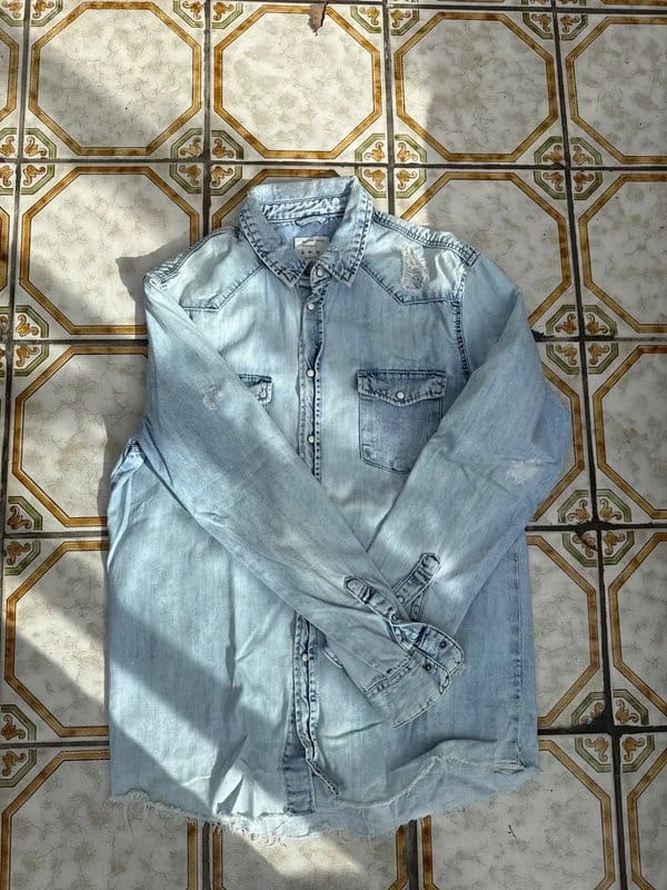The Bershka Light Blue Denim Shirt for Men is available in sizes M.