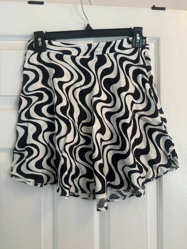 Stylish Bershka skirt in a black and white abstract wave pattern. Made from a light, silk-like material, this skirt features a high-waisted fit and a mini length. Ideal for casual outings or adding a bold statement to your wardrobe.
