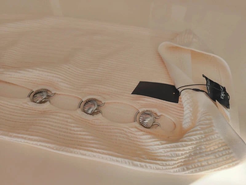 This Bershka long skirt in cream features a stretchy ribbed texture and decorative shell-like buttons for a unique touch. Perfect for casual outings or beach-inspired looks.