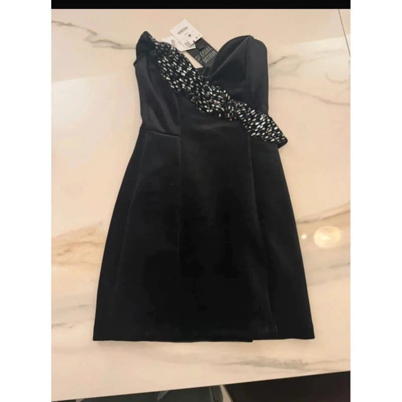 This Bershka mini dress features a stunning black velvet fabric with crystal embellishments for a glamorous touch. The one-shoulder neckline and sheer back add a touch of sophistication, making it perfect for evening events.