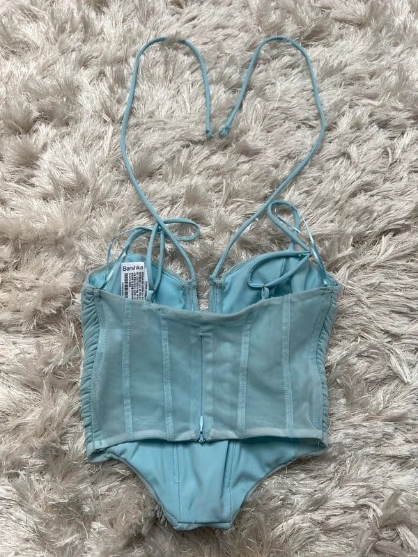 A chic light blue bustier top from Bershka made from tulle fabric. It features a corset-style design with adjustable straps and a zipper closure. Ideal for a casual yet elegant look.