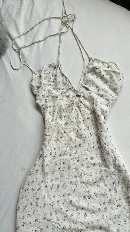 Charming Bershka dress in white with a floral print. Features a halter neck with tie-back straps and a smocked bodice. Ideal for summer outings and beach holidays.