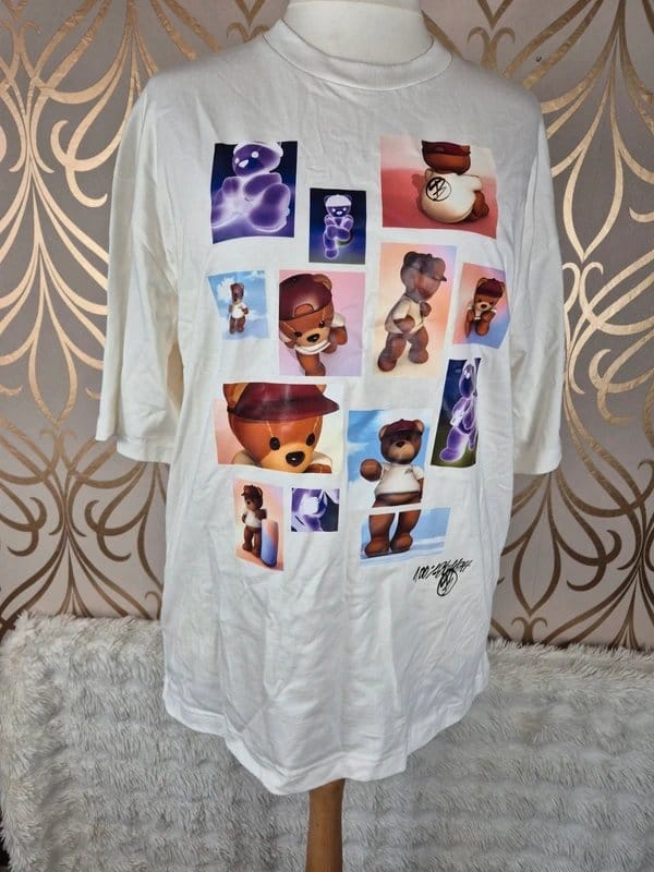 Trendy Bershka graphic t-shirt in white featuring multiple cartoon bear illustrations. Made from soft cotton for comfort, this oversized tee is perfect for a casual, laid-back look.