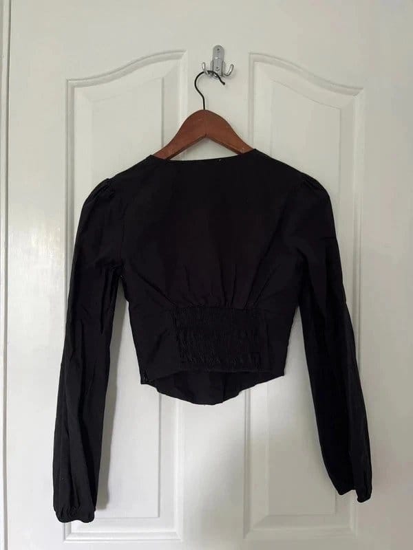 This Bershka black crop top features a corset-style front with a small tear on the side. Made from stretchy fabric, it offers a fitted silhouette with long sleeves.