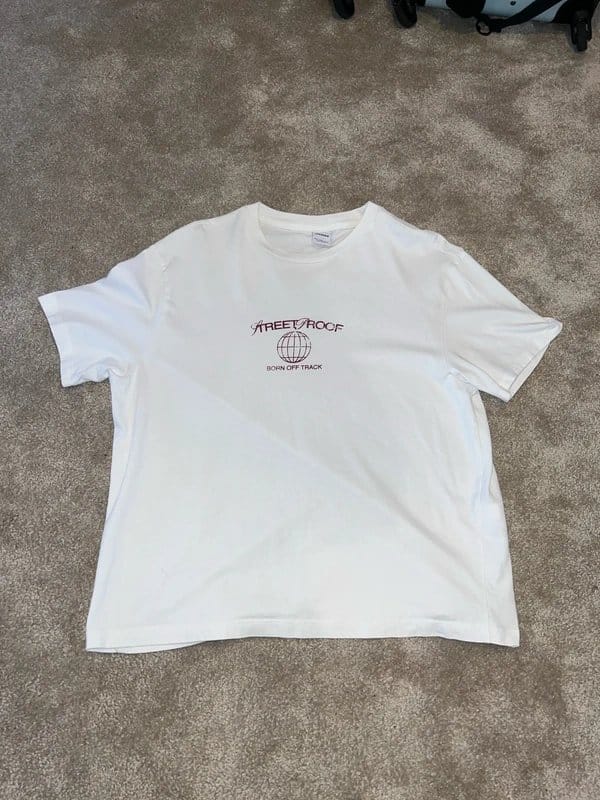 The Bershka White Imprinted T-Shirt for Men is available in sizes S.
