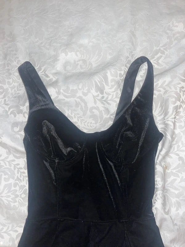 Stylish Bershka black velvet jumpsuit with a scoop neckline and fitted bodice. The flared skirt adds a touch of elegance, perfect for evening events or casual outings.